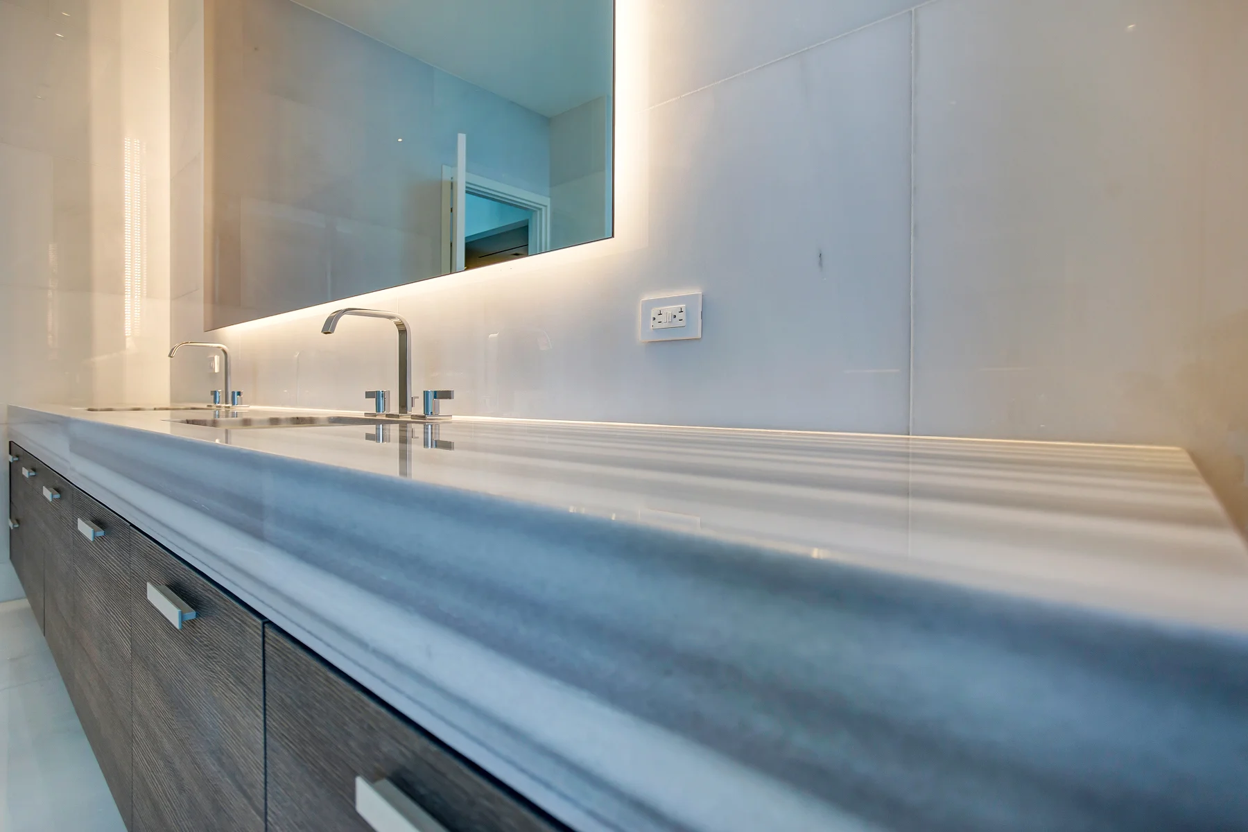 An immense mirror casting light throughout the living room becomes a 75” high-definition television in an instant. The soundtrack of your choosing plays throughout each room as if by magic; speakers built into the walls are meant for ears, not eyes. Never again feel the distraction of technological features competing with the visual pleasures of your home.